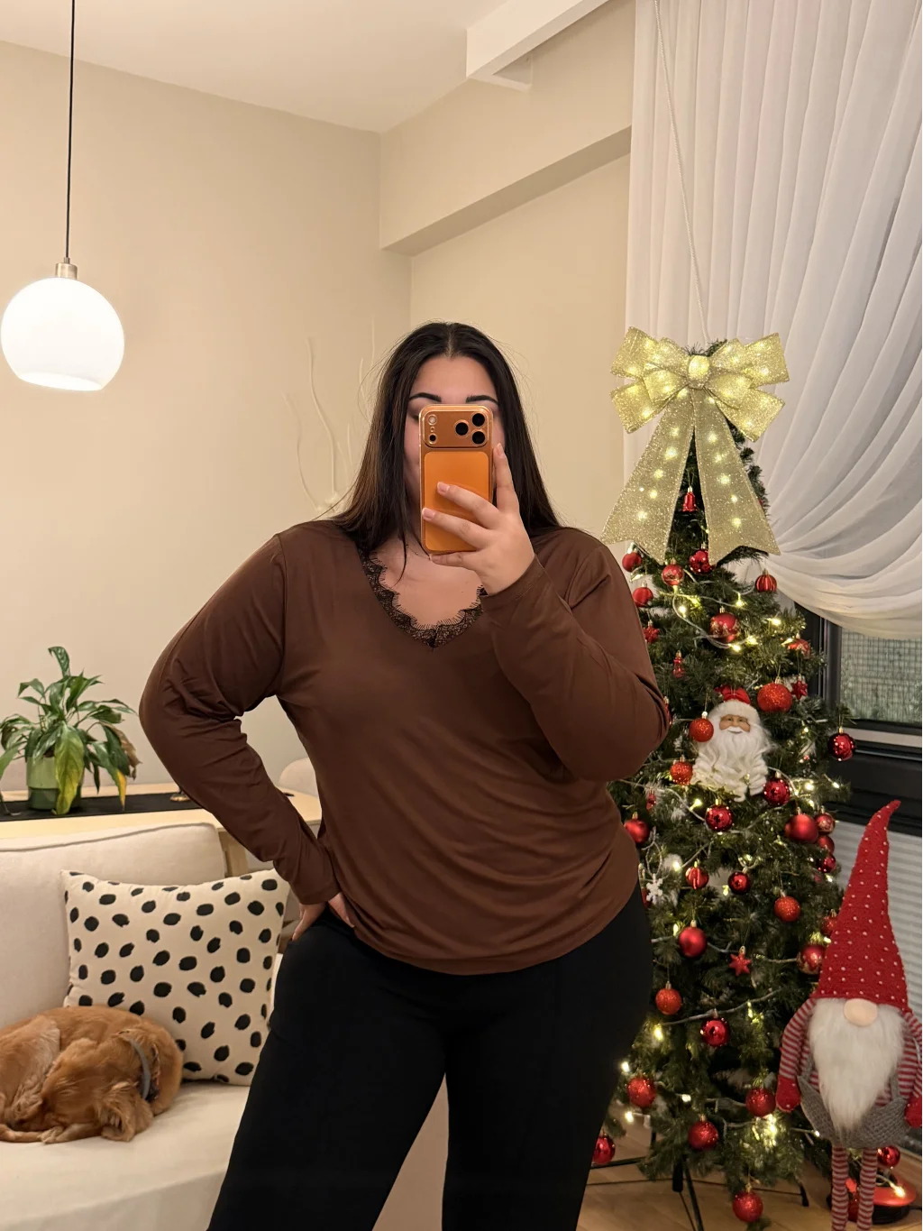 V Yaka Dantel Detaylı Esnek Modal Bluz - Kahverengi