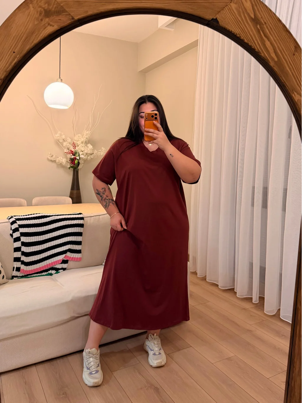 V Yaka, Geniş Kesim, Esnek Pamuklu Tişört Elbise