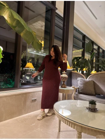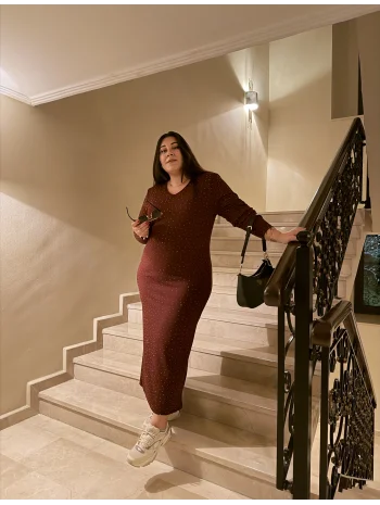 Kruvaze Yaka Esnek Triko Elbise - Kahverengi
