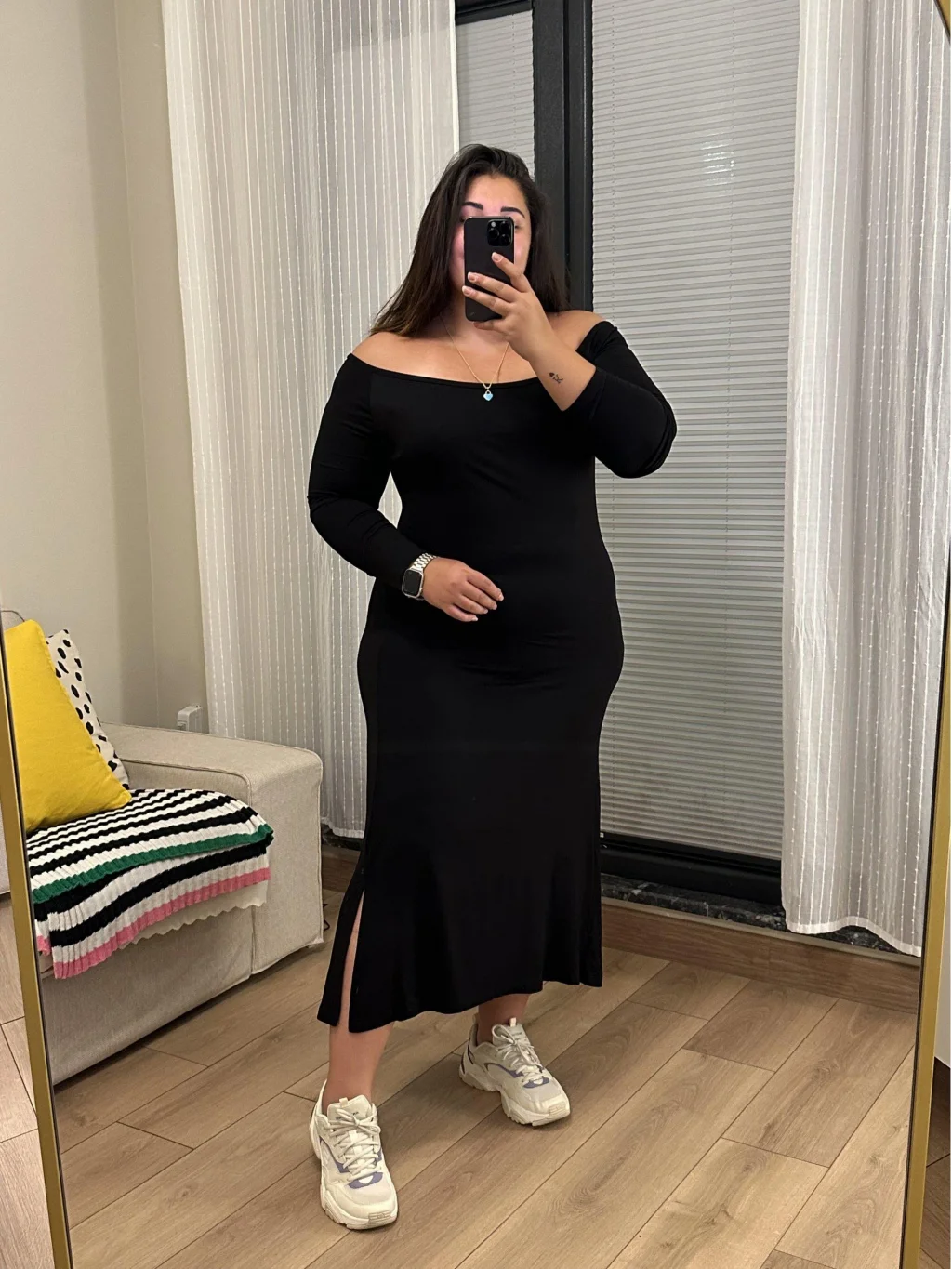 Yırtmaçlı Madonna Yaka Esnek Penye Elbise - Siyahh